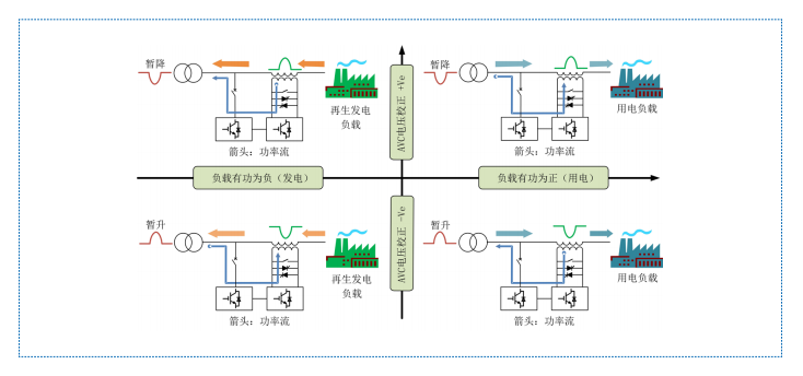 當負載為發電狀態(有功功率為負)時,電源側電壓發生暫升,整流器從電網側獲取能量,逆變器 又把獲取的能量通過變壓器注入到主回路中,以補償電壓的暫升。