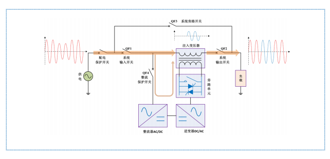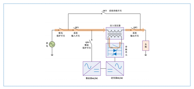 HTAVC 在自身設備發生故障時會自動轉為內部旁路供電,旁路快速響應由晶閘管切換完成,旁 路保持由機械觸點完成。此時,逆變器不生成補償電壓,市電通過注入變壓器主回路側繞組直接為負載供電。