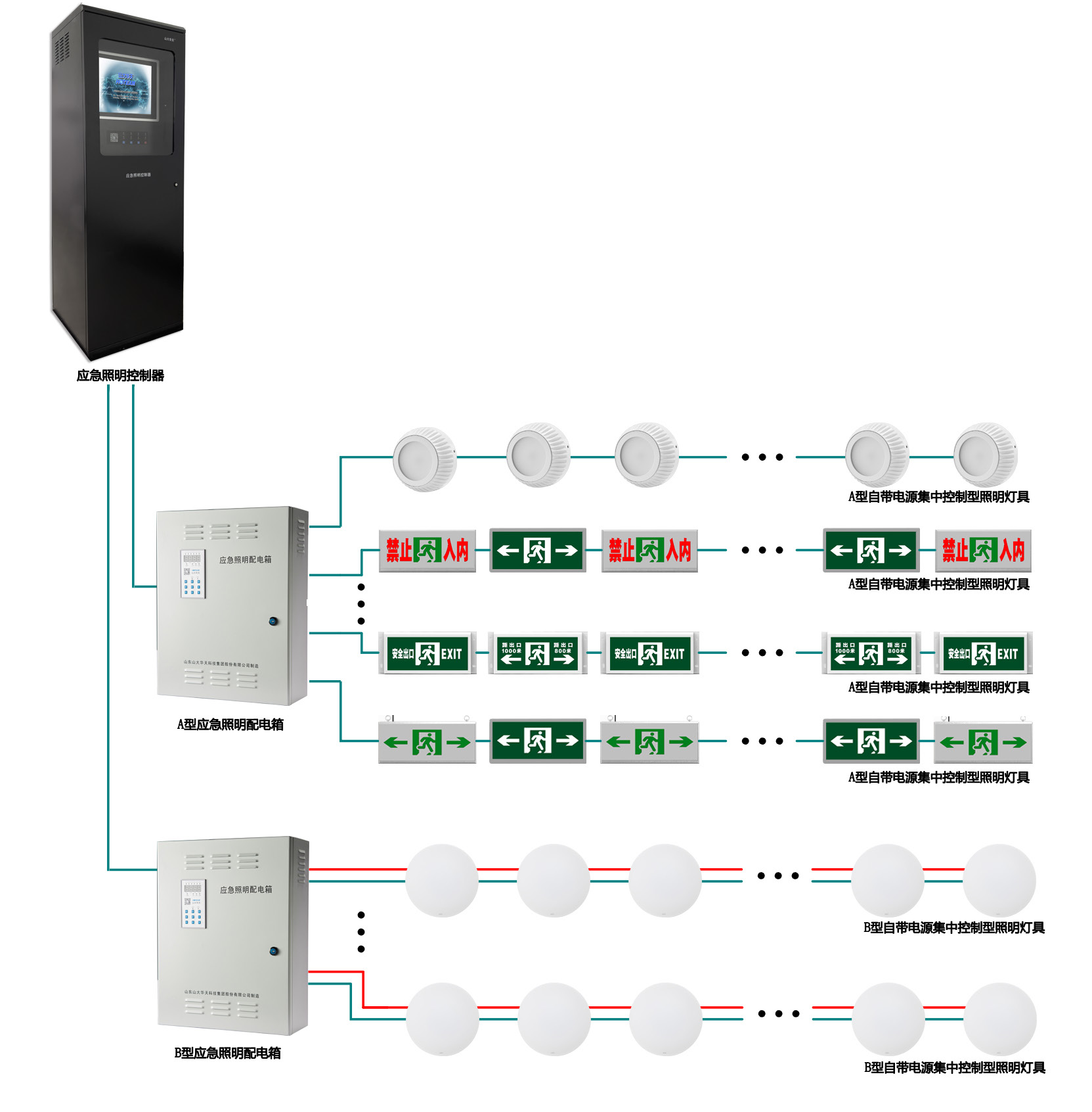 系統(tǒng)由應急照明控制器、應急照明集中電源和集中電源集中控制型消防應急燈具等組成。