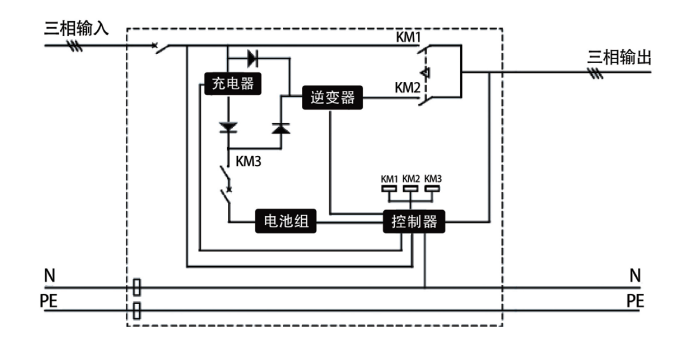 說明:設(shè)備內(nèi)部由逆變器、充電器、電池組、控制器、接觸器KM1、KM2、KM3等構(gòu)成。設(shè)備處于“自動(dòng)”運(yùn)行狀態(tài)時(shí),如果市電輸入正常,KM1、KM3吸合,輸出市電;同時(shí),市電經(jīng)充電器對(duì)蓄電池充電,此時(shí)逆變器不工作。當(dāng)市電中斷或異常時(shí),控制器啟動(dòng)逆變器,同時(shí)控制KM1斷開、KM2吸合,電池組的直流電經(jīng)過逆變器轉(zhuǎn)換為交流電供給應(yīng)急輸出負(fù)載。其他運(yùn)行模式僅為控制方式上的區(qū)別,工作原理基本相同。
